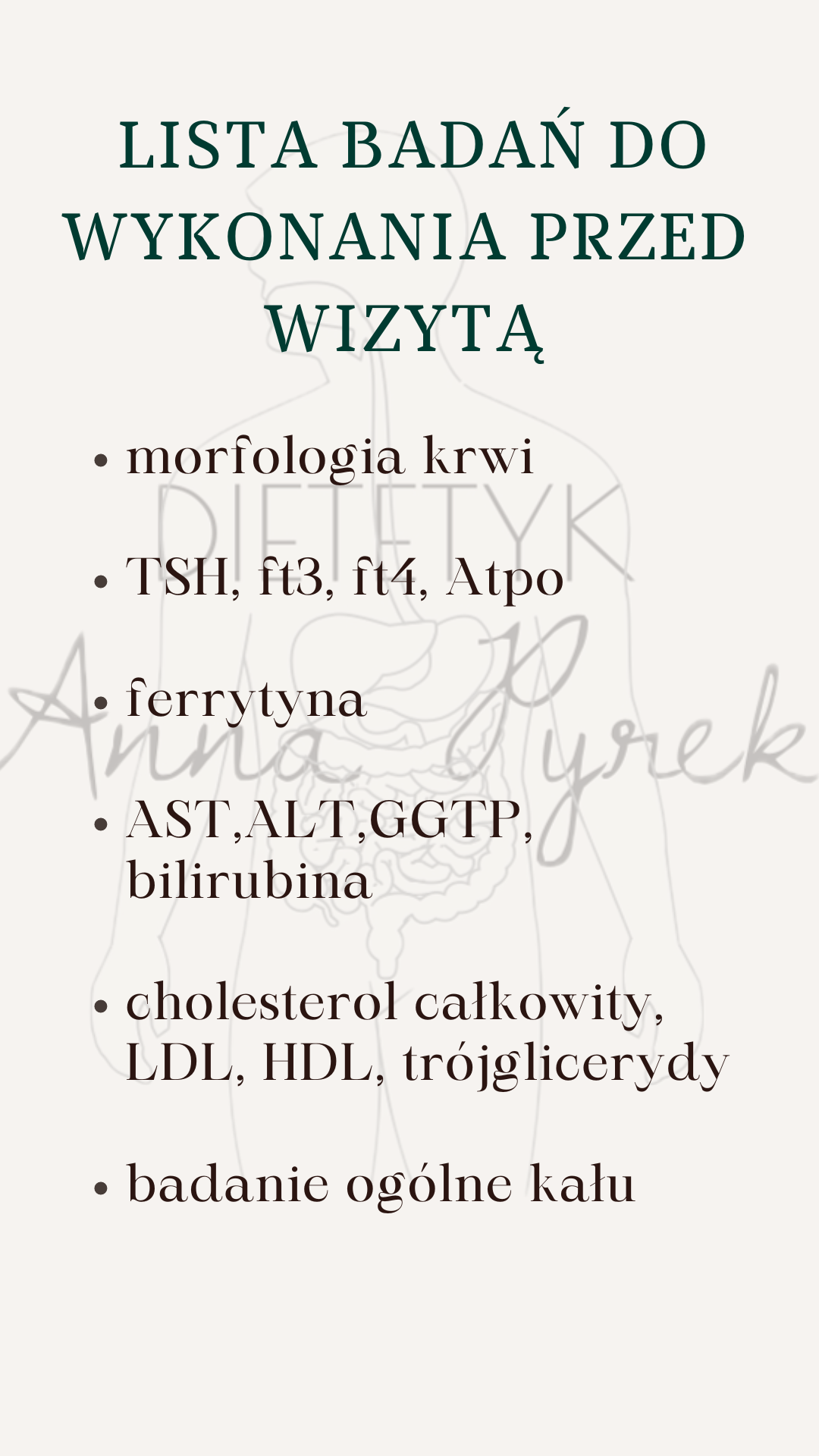 - zalecenia co do suplementacji oraz sposobu żywienia